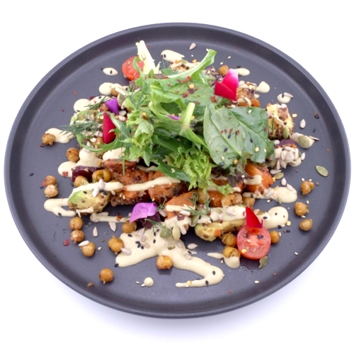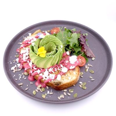 Avocado, beetroot hummus, feta cheese, mixed salad, tomato and sesame on sourdough