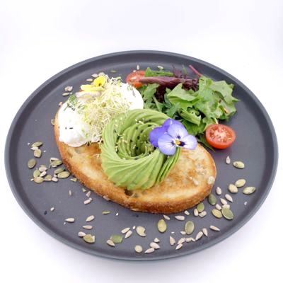 Avocado, poached / scrambled eggs, mixed salad, tomato and sesame on sourdough