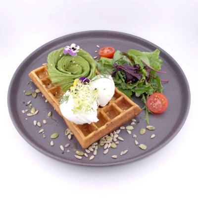 Avocado, poached / scrambled eggs, mixed salad, tomato and sesame on belgian waffle