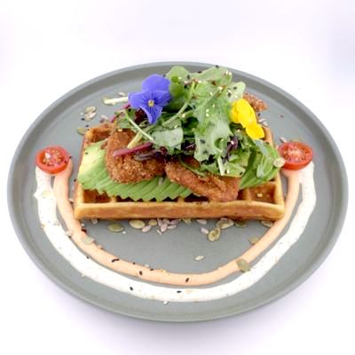 Avocado, chicken schnitzel, mixed salad, mixed herbs sauce, sriracha mayo, chilli flakes and sesame on belgian waffle