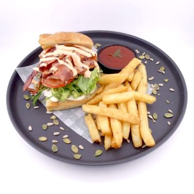 Avocado, bacon, mixed salad, tomato, aioli, sriracha mayo with focaccia and chips